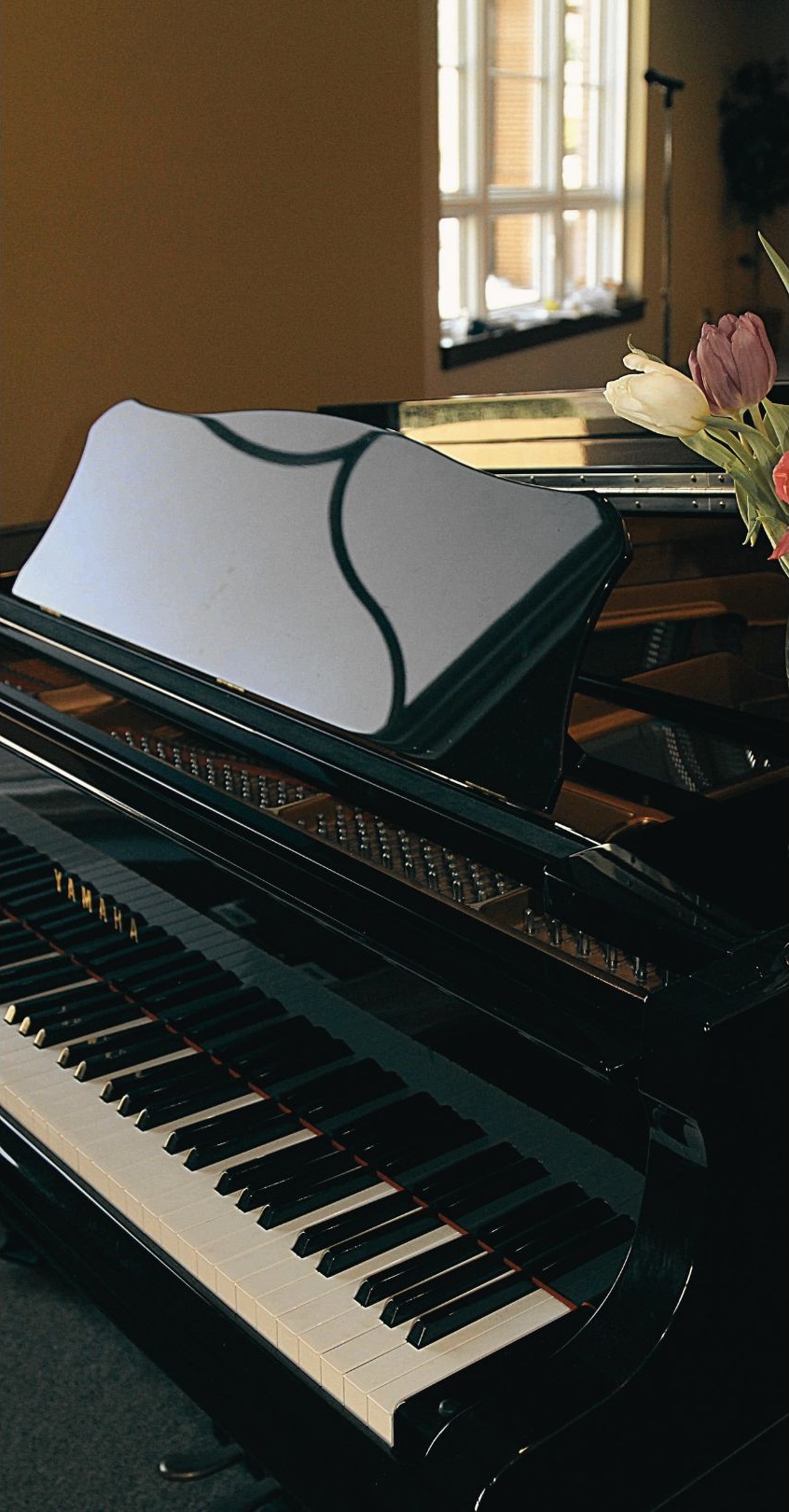 Dual screen projector, elevated stage, sound system, high speed internet access. A baby grand piano sits in the hall.